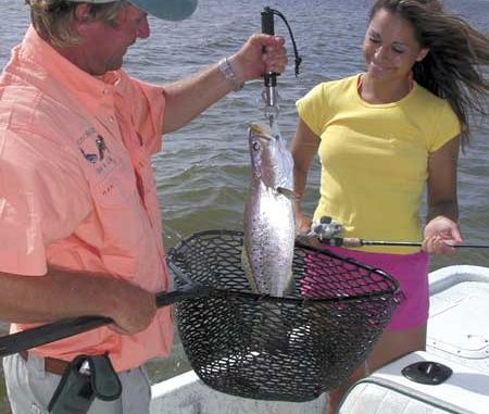 As soon as my fishing companion, Teri McFarland of Fittstown, Okla., cast a Stanley Wedge Tail grub, it hit the water, her line twitched and she set the hook. When I looked to see McFarland’s rod bowed, I felt a tap on my line and set the hook. We both had on nice-sized speckled trout when I heard Biddy report, “Oops! I missed mine.”