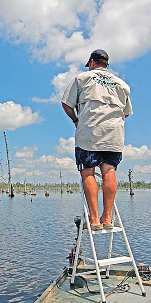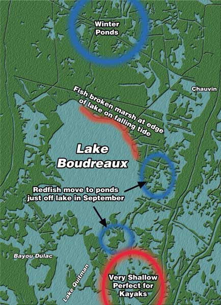 This time of year, massive schools of redfish make the water around Lake Boudreaux turn bronze.