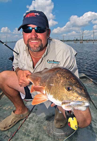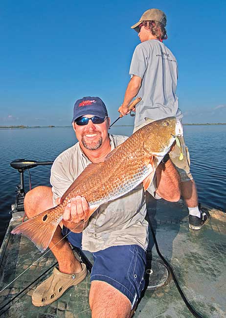 The guide was the first to cast his cocaho, but Garrett wasn’t far behind. As soon as the baits hit the feeding school, both anglers set the hook and began wrestling reds to the boat. They ran around the 18-foot craft, hooting and passing their rods through each other’s arms to keep their lines from tangling.