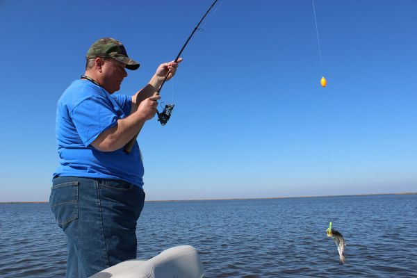 Frequently off-colored water due to persistent late-spring breezes and the river water coming from Mardi Gras Pass combine to make it hard to beat the triple threat of the sound of the popping cork, the ability of the fish to find the bait due to it being suspended in the water column and the flash of the bait, even when it’s not really a flash.