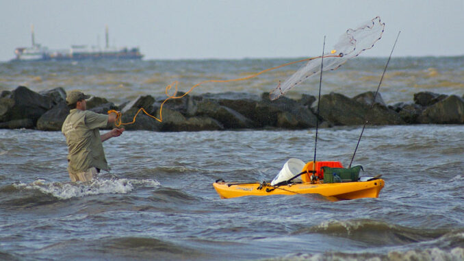 Throwing a cast net from land or a dock is one thing, however, doing so while wading or in your kayak takes some extra effort. If you plan to throw a net while in your kayak, smaller nets in the four to six foot range are much easier to manage. If you have good balance and your kayak is super stable, you can carefully cast the net while standing. The extra height allows the net more time to fully open before hitting the water. A small cast net can be successfully thrown from the seated position in the kayak, but it takes some patience.