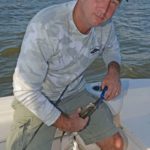 Below the swivel is a 15-inch, 40-pound test monofilament shock leader. It’s topped off with a No. 4 treble hook. A live shrimp are hooked under the horn on top of its head with one of the hooks in the treble.