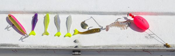 When fishing the jetties leading out to the Gulf, the anglers change lures to adapt to the submerged, rock structure habitat on the east and west sides of the channel.