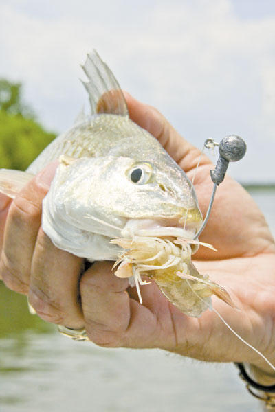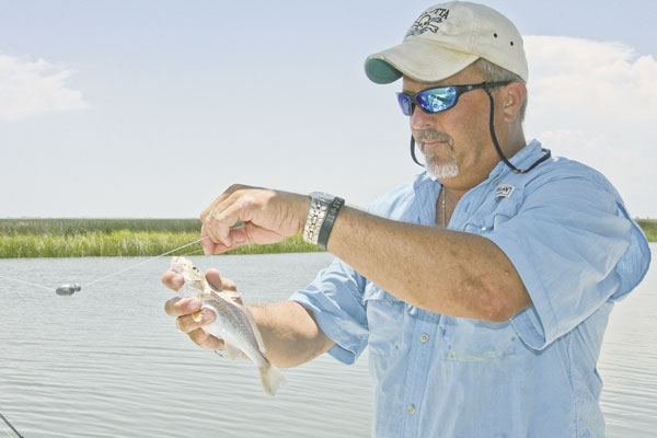 We made our way into Goose Pond Bayou, where Castaing dropped anchor in one of the sharp, outside bends so he could cast back toward the inside point. Croaker are found on the bottom, so he had rigged up a Carolina rig heavy enough to keep his shrimp down where the croaker live.
