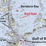 The reef is located at about 3.75 miles at a bearing of 357 degrees magnetic from the center of Barataria Pass. Surrounding waters are between 6 and 8 feet.The charts show the reef as a shoal where the surrounding water intermittently covers the island reef. The water over the shoal may run from 1 1/2 to 4 feet. The reef is shown to be about half a mile in length in a 11-degree to 191