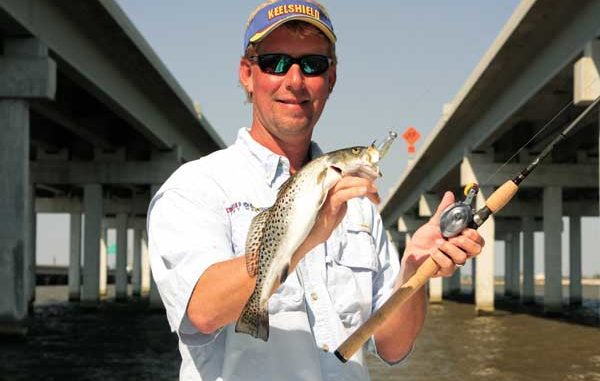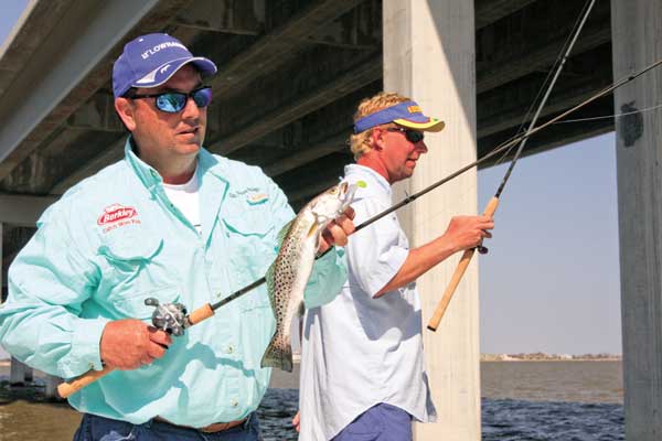 Pellegrin was already casting his opening night Deadly Dudley Bay Chovey under the bridge and between the pilings before Schlumbrecht could drop his trolling motor in the uncharacteristically muddy water. Out the corner of his eye, Schlumbrecht saw and started teaching.