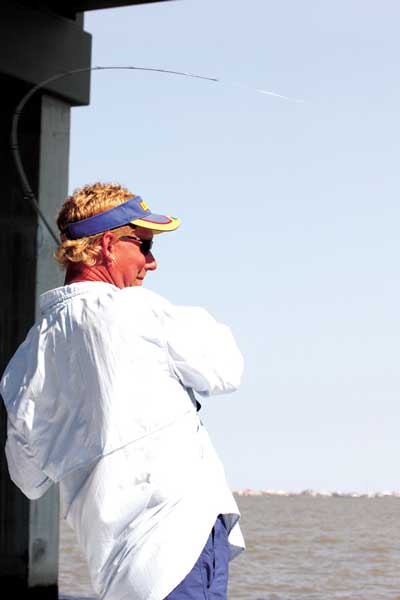 “You may catch some fish up in there, but there’s a lot of trash, and you’ll stay hung up a lot,” he playfully scolded. “Stick with the pilings, and try pitching your bait as close as you can rather than cast overhand. It’s just like pitching a jig to a cypress tree when you’re bass fishing. Grab your bait in one hand and swing it out while lifting your rod.”