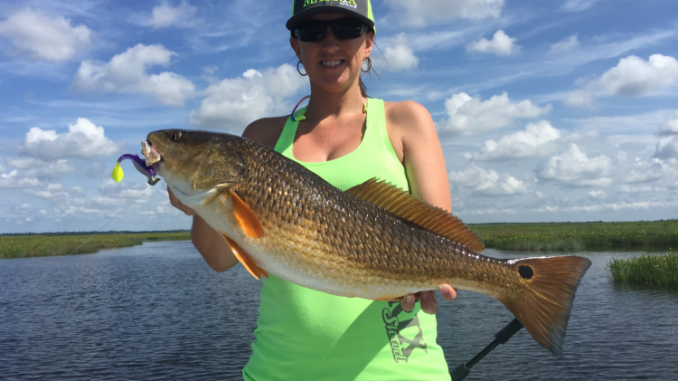 “The best part about pond-fishing reds in October is you get speckled trout intrusion, so don’t pass up your bayous,” he said. “That’ s another reason I like the 5/16 ounce jighead that’s a little heavier. That way when I’m going from a duck pond into a creek with 6 or 7 feet of water, I can jig it easier to reach trout toward the bottom.”