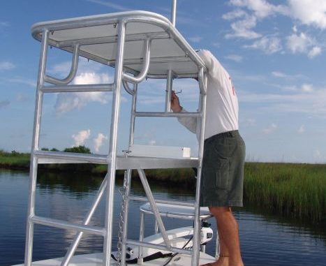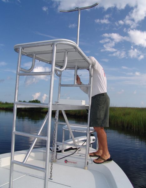 Travis Holeman is quick to clarify the difference in a towerboat and a boat with a tower, or elevated platform, on its bow. For him, it’s all about fishing from an elevated position, but driving with “feet on the floor.” In a pinch, a fiberglass ladder will get you some needed altitude, but today’s marine fabricators can assemble specialized fishing structures to fit a broad range of specifications.