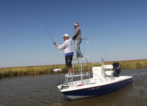 The Holeman brothers have rigged their 22-foot bay boat with a specialized tower that suits their style of fishing — two brothers (one of whom is no small fellow) simultaneously elevated.