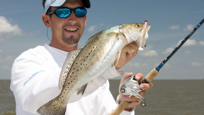 Pike’s projection of three or four trout under each group of birds was right on the money at our first stop. Although it probably didn’t matter one bit, Pike was fishing an avocado/chartreuse Old Bayside Speck Grub under his popping cork while I tried out the new MirrOlure 3-inch Soft Sardine in motor oil/chartreuse. Three trout in the box, and we made our next move.