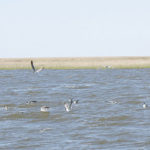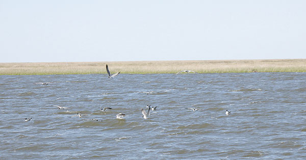 The winds started to show up as we made our way through China Pass into Long Lagoon, and we saw a decent flock of gulls working over the surface, diving on jumping shrimp. Sanchez guided the boat so we were well upcurrent of the action and killed the motor far enough away so as not to spook anything. The key, he explained, is to drift into the action, and not try to approach it from the downcurrent or downwind side.