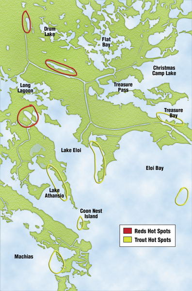 • Cuts from LaLoutre into Treasure Bay, especially on a south wind. “It’s protected, and it’s productive. Live shrimp under a cork,” he said.