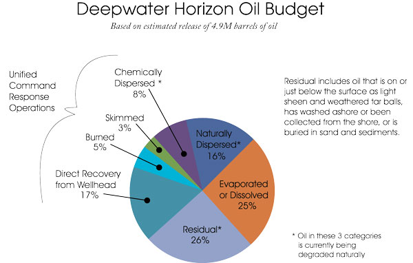 Corexit 9500 contains three components — a surfactant, petroleum distillates and propylene glycol. Depending upon conditions, it has a half-life of two days to two weeks. In other words, some time between two days and two weeks, half of the applied dispersant has broken down. Two days to two weeks later, half of what remains has broken down, and so forth. No dispersants were applied in the Gulf of Mexico after July 19.