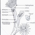 Bryozoans are very simple animals. The tentacles of an individual zooid, collectively called a lophophore, surround the pharynx or throat of the “mouth.” The tentacles are covered with tiny cilia (hairs) that create a current that draws food items to the mouth.