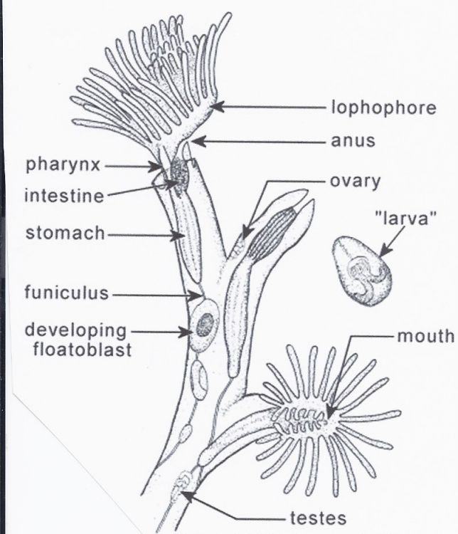 A primitive nerve called a “funiculus” runs the length of each animal. Sperm and statoblasts (labeled in the graphic “developing floatoblast”) develop along the funiculus. They have no gills, heart or blood.