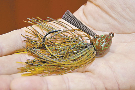 In late October when the weather’s cooler, I’ll flip the Hack Attack Jig. The more the bass feel the onslaught of winter, the more they seem to prefer a bigger, bulkier bait like the jig. If the bass are holding tight to a tree in shallow water, I’ll use a 1/4-ounce slip sinker, or if they’re farther away from the tree in deeper water, I’ll fish the 3/8-ounce slip sinker.