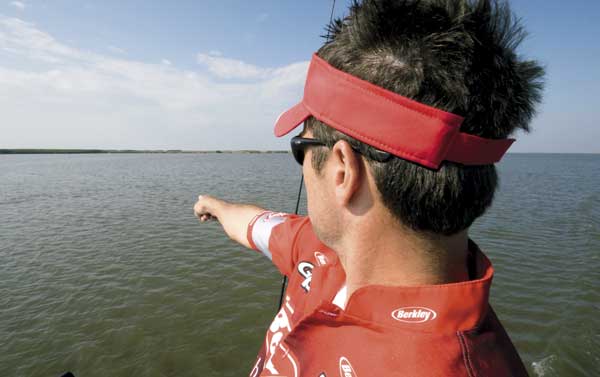 “We look for fish during practice,” he said, “but more importantly we look for places where the fish are going to go once the fishing pressure increases. The main things we look for are contour changes — things like mud humps from old, eroded marsh islands, troughs, guts, anything that’s different about the bottom. Being in the tower makes spotting these bottom changes a lot easier.”
