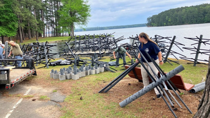 The fish attractors were assembled and deployed by LDWF fisheries biologists, members of the Lake Claiborne Watershed District Commission, MLF Fisheries Management Division staff, Duck Dynasty celebrity and avid crappie angler John Godwin, along with MLF anglers Kevin VanDam, Gary Klein, and Dakota Ebare.
