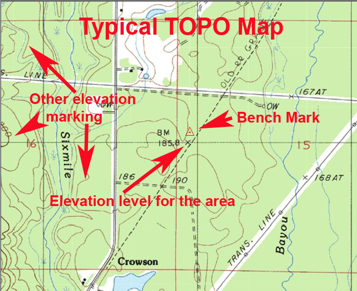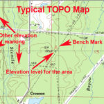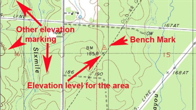 The number and small “X” you see on your topo map is not a benchmark (BM), but the location could be next to one. The small “X” is the vertical designation for that point based on feet above sea level. Benchmarks when shown are usually small red triangles.