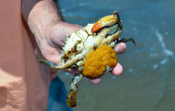 There is no minimum size for recreationally-caught crabs; however, all berry crabs (aka sponge crabs) must be returned to the water immediately after being caught. These are female crabs with large orange to brown sponge-like masses of eggs nestled between their belly flaps and their bodies.