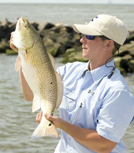 “A lot of people go with the Carolina rig out on the ends of the jetties,” he said. “All it takes it a kahle hook, a swivel and an egg sinker to get your bait to the bottom. This is also where the crabs and live mullet come more into play. Cut bait works well too. I sometimes get a big mullet and cut it into three chunks. All these smelly baits just sitting on the bottom out there in that eddy are just too much for those big reds to stand.”