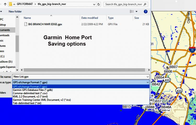 The Captain Paul’s Fishing Edge program for a Lowrance system comes with both a Lowrance .usb data file and a .gpx (GPS Exchange Format) data file. The Captain Paul’s Fishing Edge for a Garmin comes with .gdb (Garmin Data Base) file. The newer .gpx file format is an attempt to have a common data transfer file throughout the GPS industry. This attempt will probably still take a period of time, so most units still have the ability to read their old format as well as the newer .gpx format.