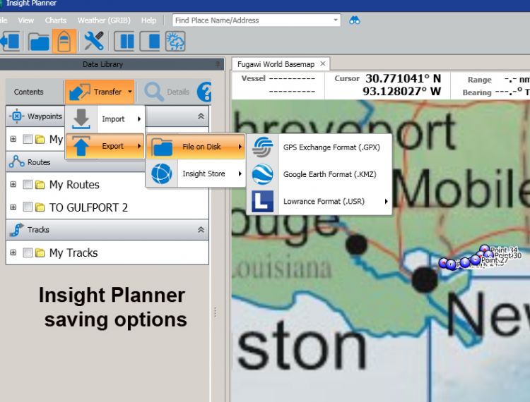 According to the Lowrance web site, “Insight Planner is the ultimate PC software for marine navigation planning with Lowrance chart plotters. Create waypoints, routes, and points of interest (POIs), on a wide variety of supported cartography platforms such as Insight, Navionics, and raster charts using the BSB format. Use it to plan routes using multiple charts for verification and safety purposes. It allows you to Transfer waypoints directly to Google Earth, as a .usr or .gpx file.”