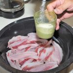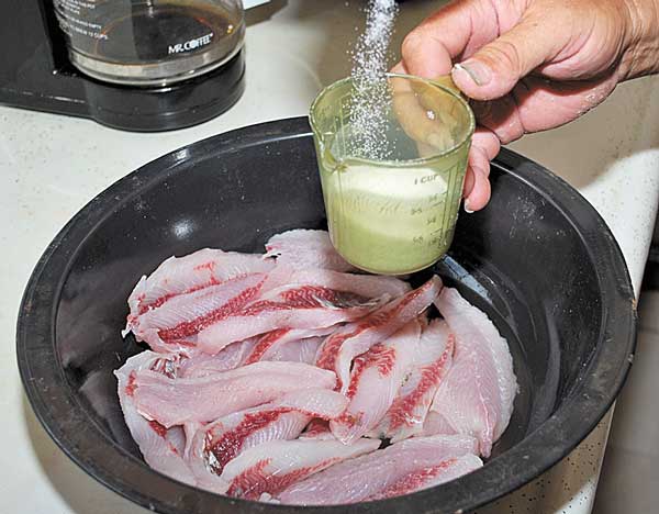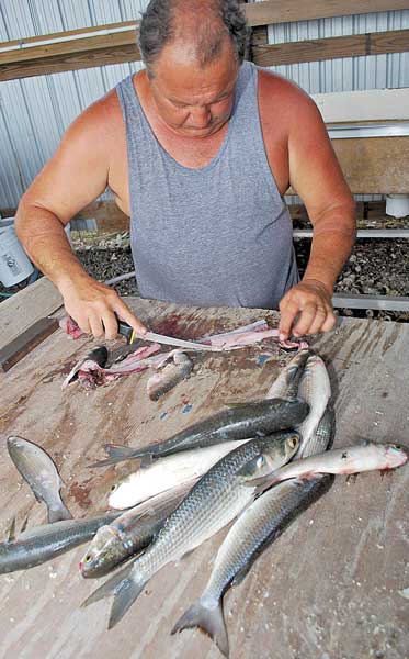 He instructs that gizzards must be rolled in something sticky, like mustard, before breading, or the corn meal won’t stick to them. The one thing he doesn’t eat from a mullet are the roe sacks, which he declares are “too bland.”
