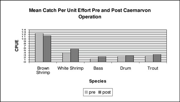 Results are similar for finfish. Post-construction CPUE at Caernarvon increased for seven of eight finfish species studied. That is, there appeared to be more red drum, black drum, sheepshead, spotted seatrout, sand seatrout, Atlantic croaker, and gulf menhaden after Caernarvon went into operation.