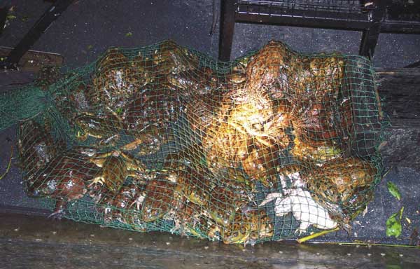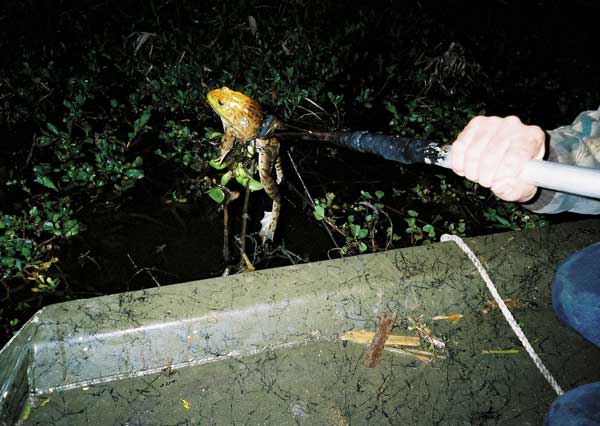 Most frog hunters go out with at least two people to the boat. One person may be doing the driving and looking for frogs, while the other is doing the catching and sacking the amphibians.