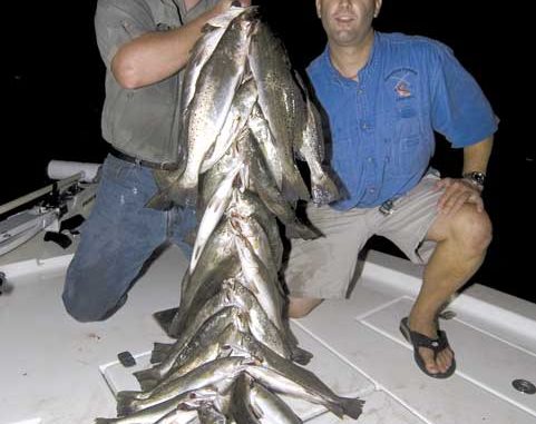 Lacoste grabbed the net and ran to Wakeland’s side, as the big trout made another splashing pass by the side of the boat. The next time it made that mistake, Lacoste swept the net under it and pulled it in the boat.