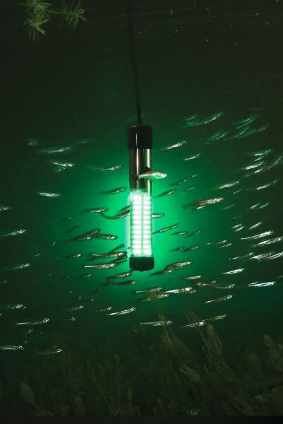 “Even short-term use of submersible light sources can stimulate the local food web. Phytoplankton and zooplankton are instinctively drawn to these light sources. A high concentration attracts minnows and other small, plankton-eating fish which in turn draws predator fish to the illuminated area.”
