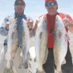 After a while, I noticed the specks caught on the croakers averaged slightly bigger than those caught on live shrimp. All of the 30 we boated ranged from 2 to 4 pounds. Three were over 5, which freaked us out. We caught trout steadily for an hour and a half — for exactly as long as the live shrimp and croakers lasted. Then we caught a few puppy drum and sheepshead on dead shrimp — but nary a speck. Not one. Not one on artificials either.