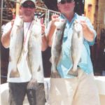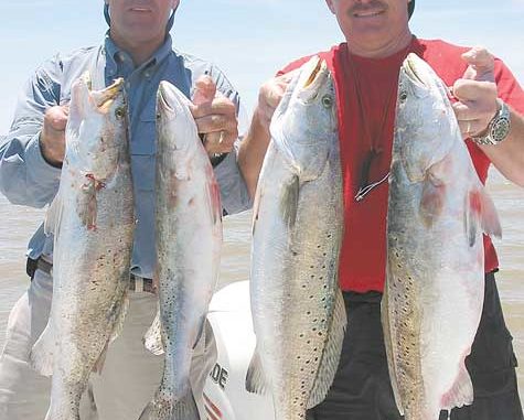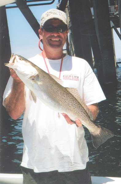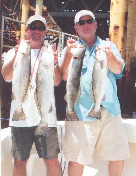 Next stop was the platform known as “The Holy Cross,” which lies about five miles east of the Central. Now we were getting way out, technically into Chandeleur Sound. Johnny headed there as his first stop and informed us via radio that the trout action was hot and heavy — and all on plastic.