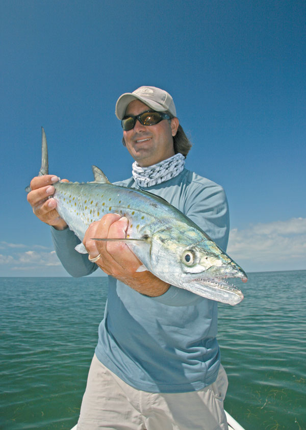 Soon I had a nice bucket of chum, and Toby and Pelayo were battling those aquatic missiles known as Spanish mackerel, their spools screaming, their rods bent into beautiful U’s.