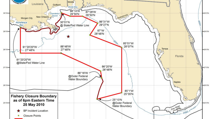 The closed area now represents 54,096 square miles, which is slightly more than 22 percent of Gulf of Mexico federal waters. This leaves more than 77 percent of Gulf federal waters still available for fishing. Details can be found at http://sero.nmfs.noaa.gov.