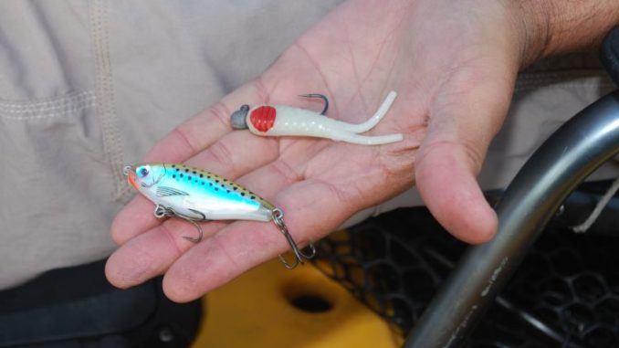 He trolled with two rods: one rigged with a MirrOlure MirrOdine trout-colored suspending lure and the other with a glow-colored H&H split-tail beetle on a ¼-ounce jighead.