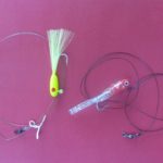 Interestingly, we also found that tandem rigging the shad or double-eyed jigs further guards against cut lines. The second fish — instead of grabbing at the swivel — tends to grab the second jig.