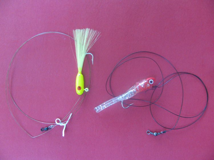 Ahead of these baits we like 3 feet of 20- to 30-pound-test nylon-coated stainless steel wire leaders in brown or black. We tie them directly (easy with this type of leader material) to the jig on one end and tie — this is important! — a black swivel on the other end.