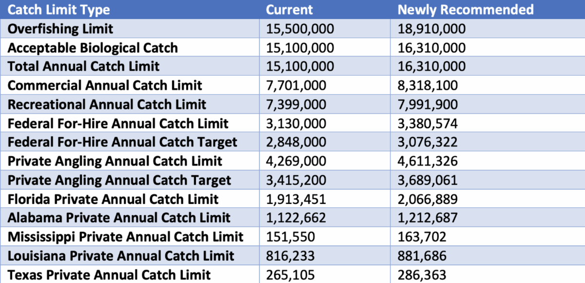 These recommendations are based on recommendations from the Council’s Scientific and Statistical Committee and new catch advice generated using updated estimates of absolute abundance of red snapper derived from the Great Red Snapper Count (Florida, Alabama, Mississippi, and Texas) and by LGL Ecological Associates, Inc. (Louisiana).