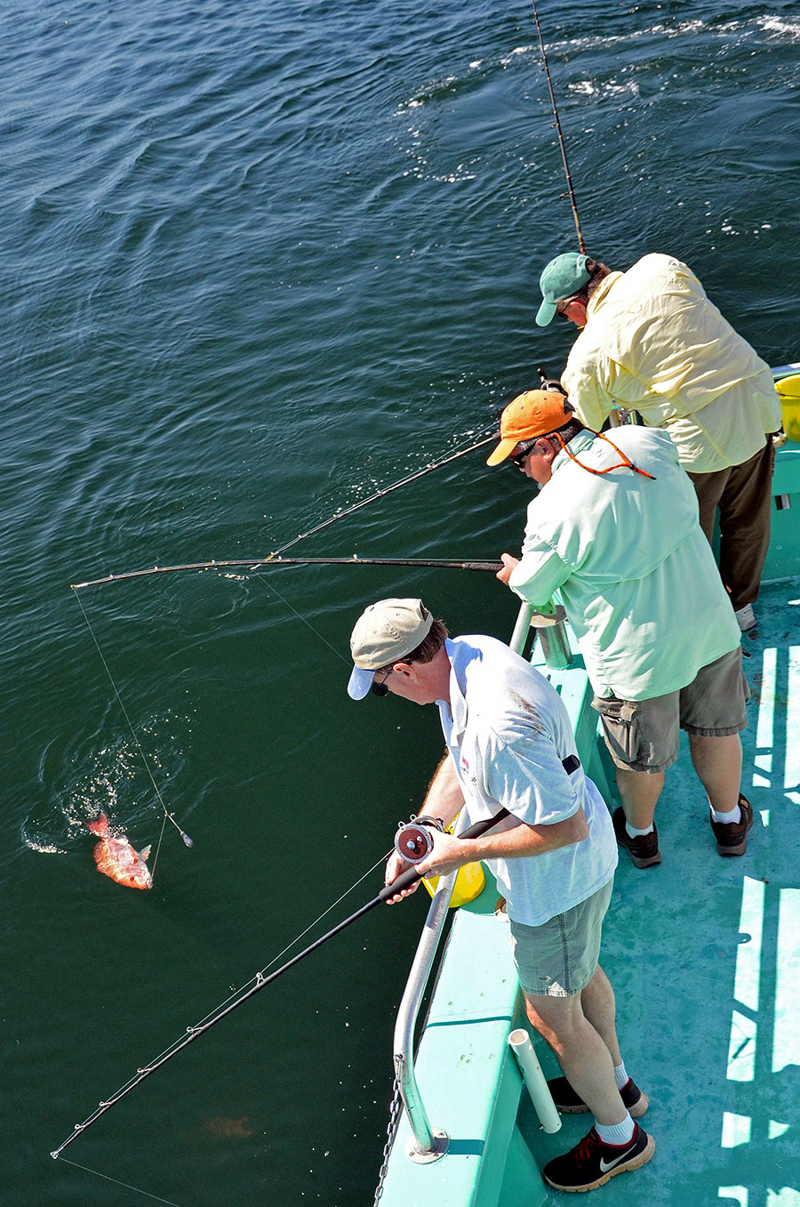 Numerous red flashes flickered about five to 15 feet down in the clear aquamarine Gulf of Mexico waters after we tossed small fish pieces overboard.