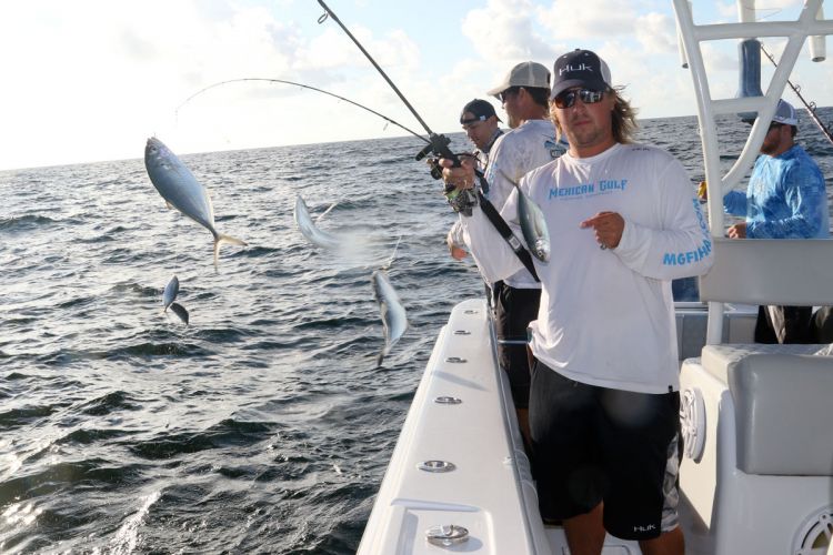 As Wells points out, tuna are highly mobile fish, so don’t be surprised to see them in open water — especially near weed lines or behind shrimp boats. Day to day, rigs represent pelagic food courts for packs of yellowfin that you’ll spot either on sonar or surface displays. Free jumpers are common, as tuna crashing surface meals blast skyward.