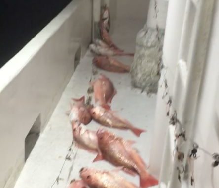 The video, which according to Facebook was posted by Albert Ballard on Feb. 2 onboard the fishing vessel Pisces, shows crew members reeling in a long line filled with red snapper.