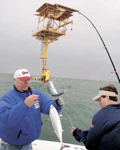 Another popular destination in the West Delta field is WD-143, which is situated near the famed Midnight Lump. When fishing deeper rigs such as this, anglers will find plenty of variety. The first 100 feet hold a mixed bag of baitfish as well as other species. Here you will find mangrove snapper schooling in large numbers against the platform legs, as well as king mackerel, cobia, bonito, bluefish, spadefish and sharks aplenty.