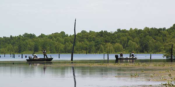 Once you’ve found a deep, dark hole in the hydrilla that’s producing, it’s not uncommon to pull several palm readers out of it. Plan to sit until the hole plays out, and then go find another. Competition on the lake is minimal. There are plenty of secluded pockets and holes in the grass to go around, and ample room for boaters to spread out on the lake.
