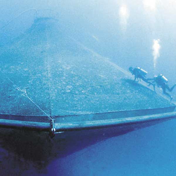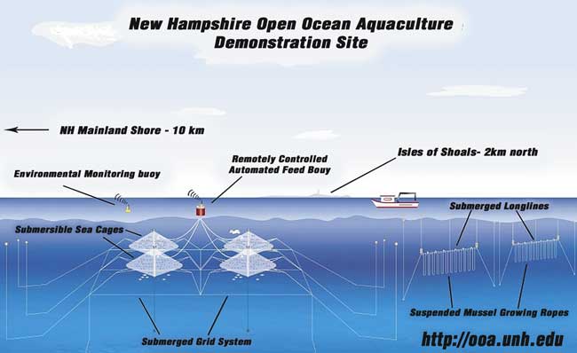 Typically, the floating net pens or cages would be anchored to the water bottom and lowered deep underwater to avoid damage from hurricanes and storms, vandalism or the routine effects of wind and waves.