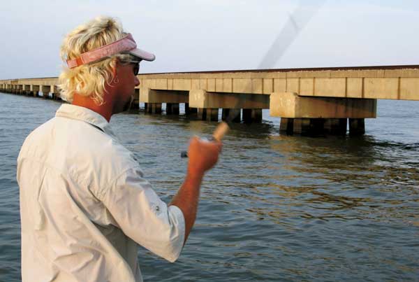 About three hours and three fish later, Schlumbrecht moved his boat in front of mine as I was leaving a piling I had just unsuccessfully fished. Not recognizing me in my bass boat, he made a cast to the piling I had just left, and caught a trout.