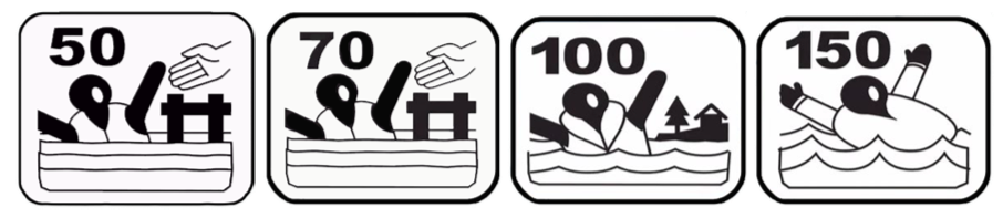 On a Level 70 label, you’ll see a dock and an extended hand with some slightly wavy lines, indicating calm water. This means this life jacket is suitable for nearshore use in relatively protected water where rescue is likely to be near at hand. You’ll note that the higher the number is on the icon, the farther away the dock and background will be, and the bigger the waves.