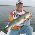 At times, we drifted farther into the open bay a good distance from the shore, but always we kept drifting until we got into some action. Whenever we did, Thomason pushed the remote button he wears around his neck for the PowerPole, and we’d stick until we were sure nothing else was biting.
